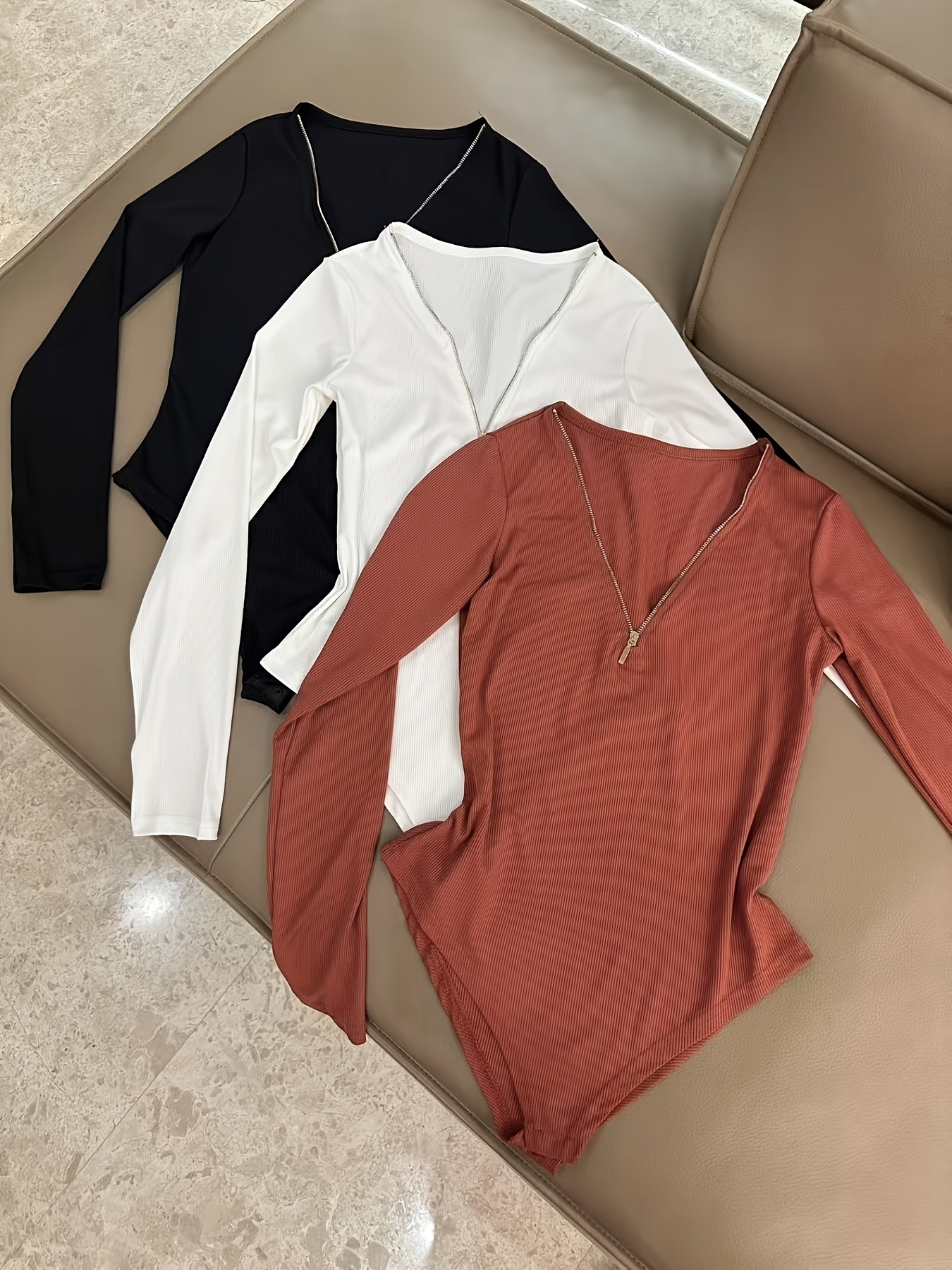 Set of 3 Autumn and Winter V-Neck Ribbed Zipper Stretch Comfortable Versatile Long-Sleeve Pullover Jumpsuit