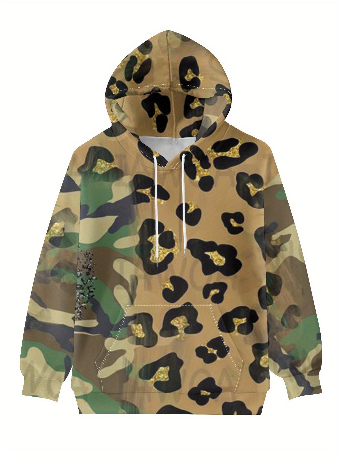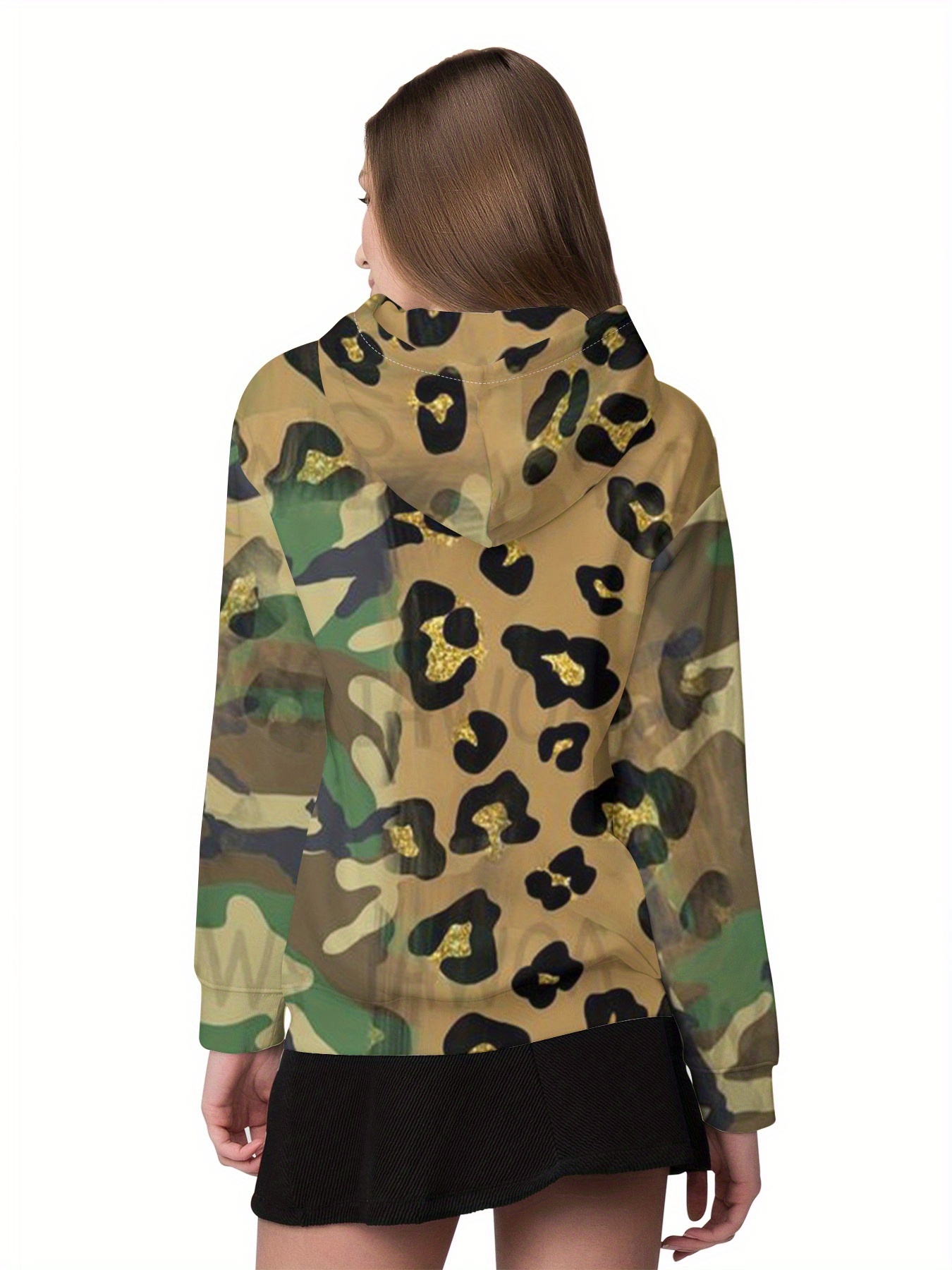 Women'S Camo Leopard Print Hoodie - Stylish Long Sleeve Pullover with Drawstring, 3D Digital Print, Stretchy Polyester, Casual Fit, Green & Black Design, Casual Wear Hoodie | Trendy Casual Style | Drawstring Hoodie