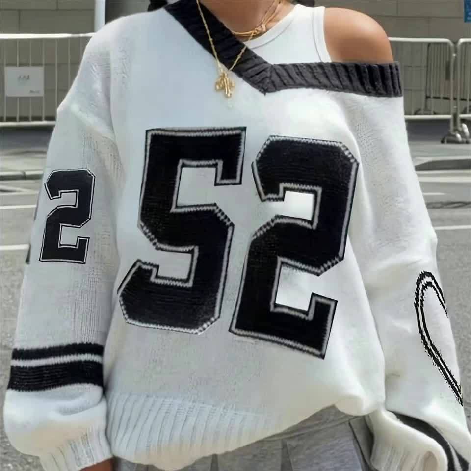 Women'S Elegant V-Neck Sweater with Heart Print - Casual Off-Shoulder Pullover, Black & White, Long Sleeve, Ribbed, Perfect for Office, College, or Casual Attire, Casual Attire Sweater | Offshoulder Fashion | Ribbed Texture