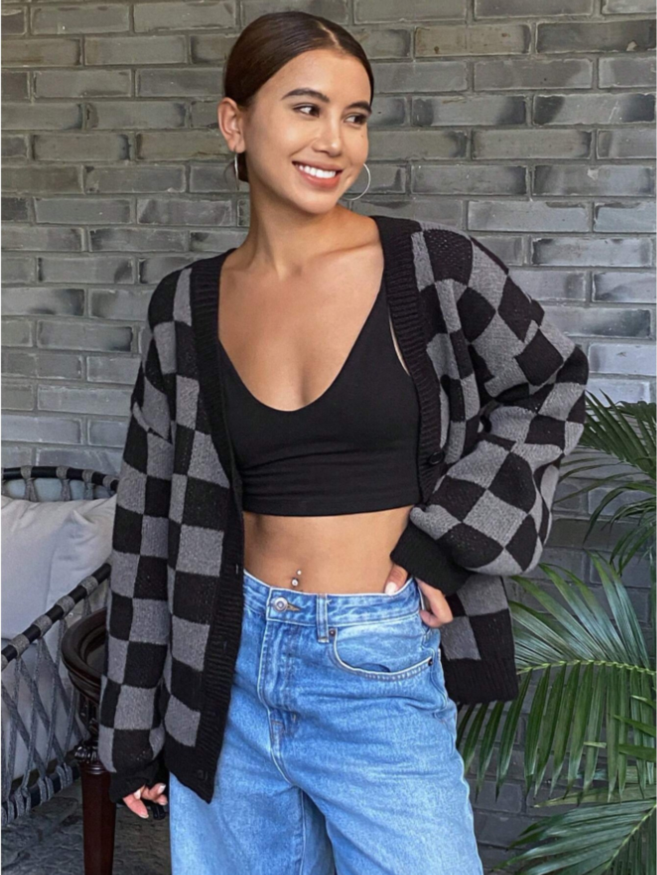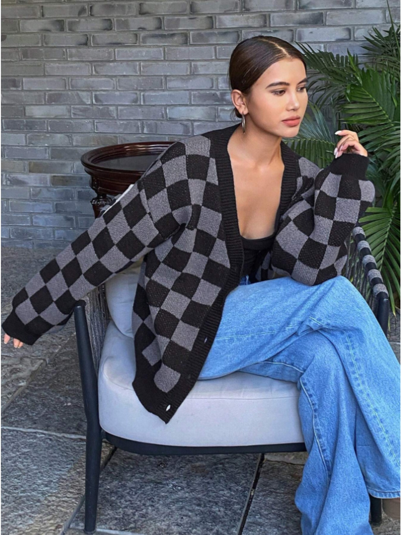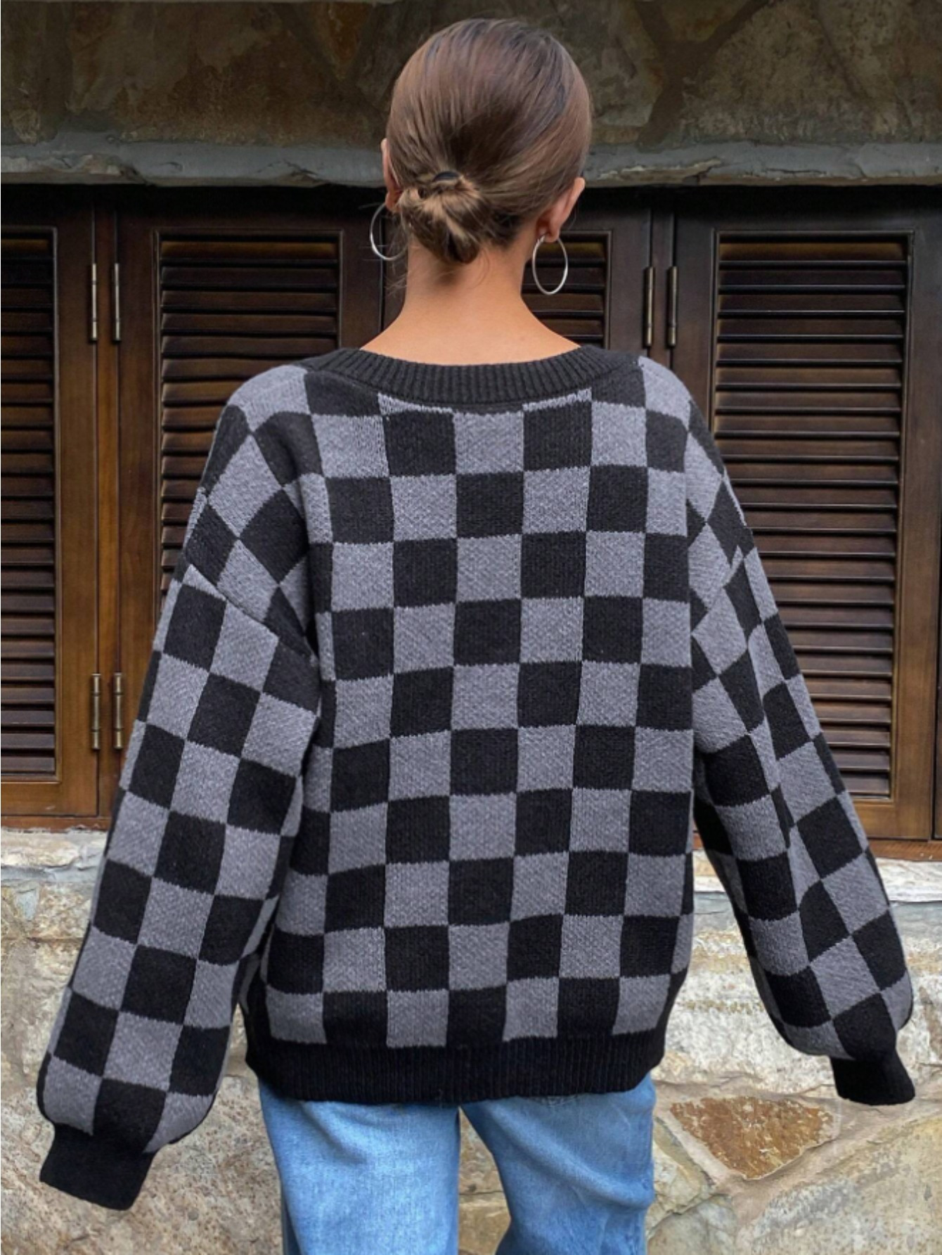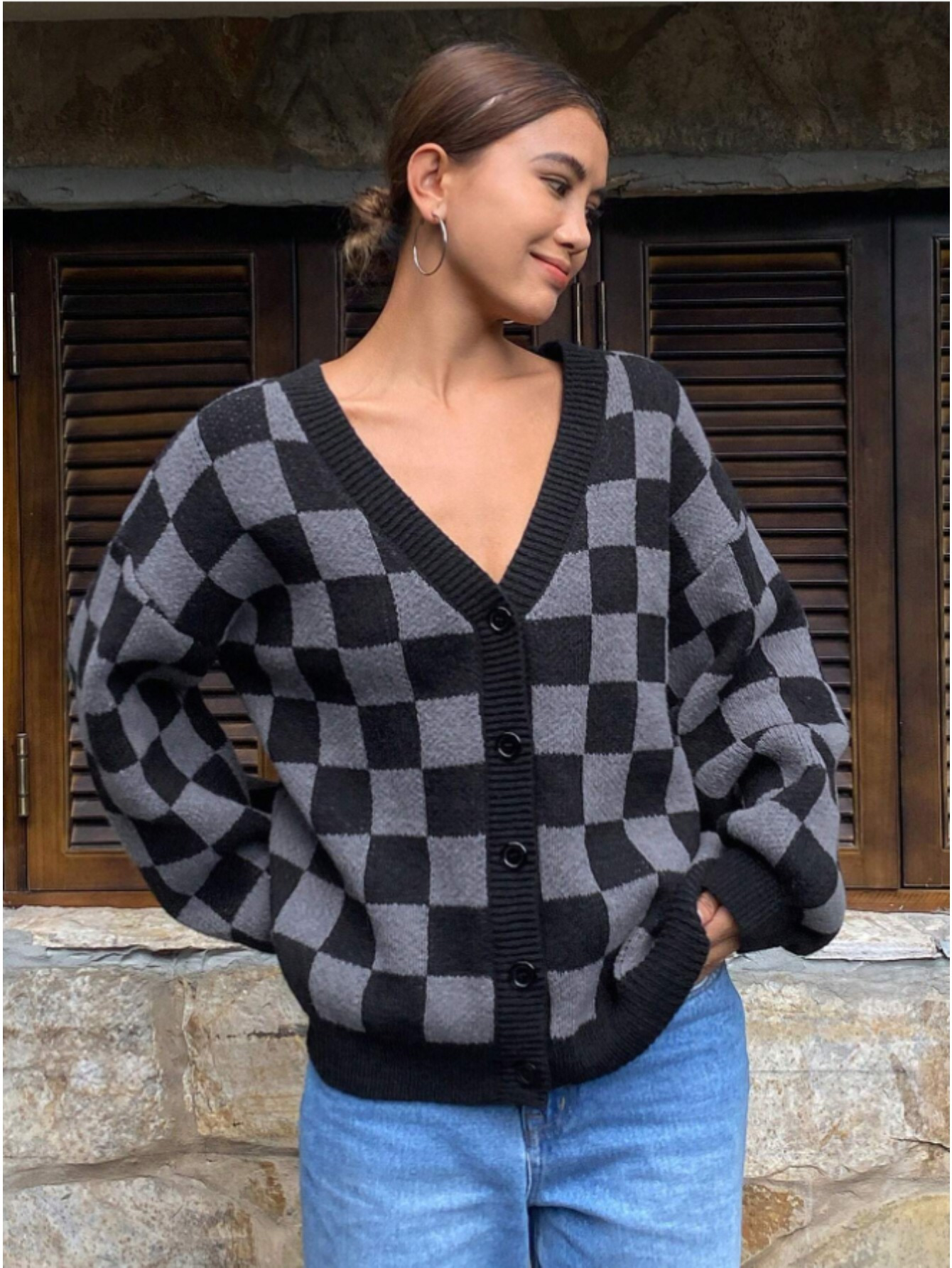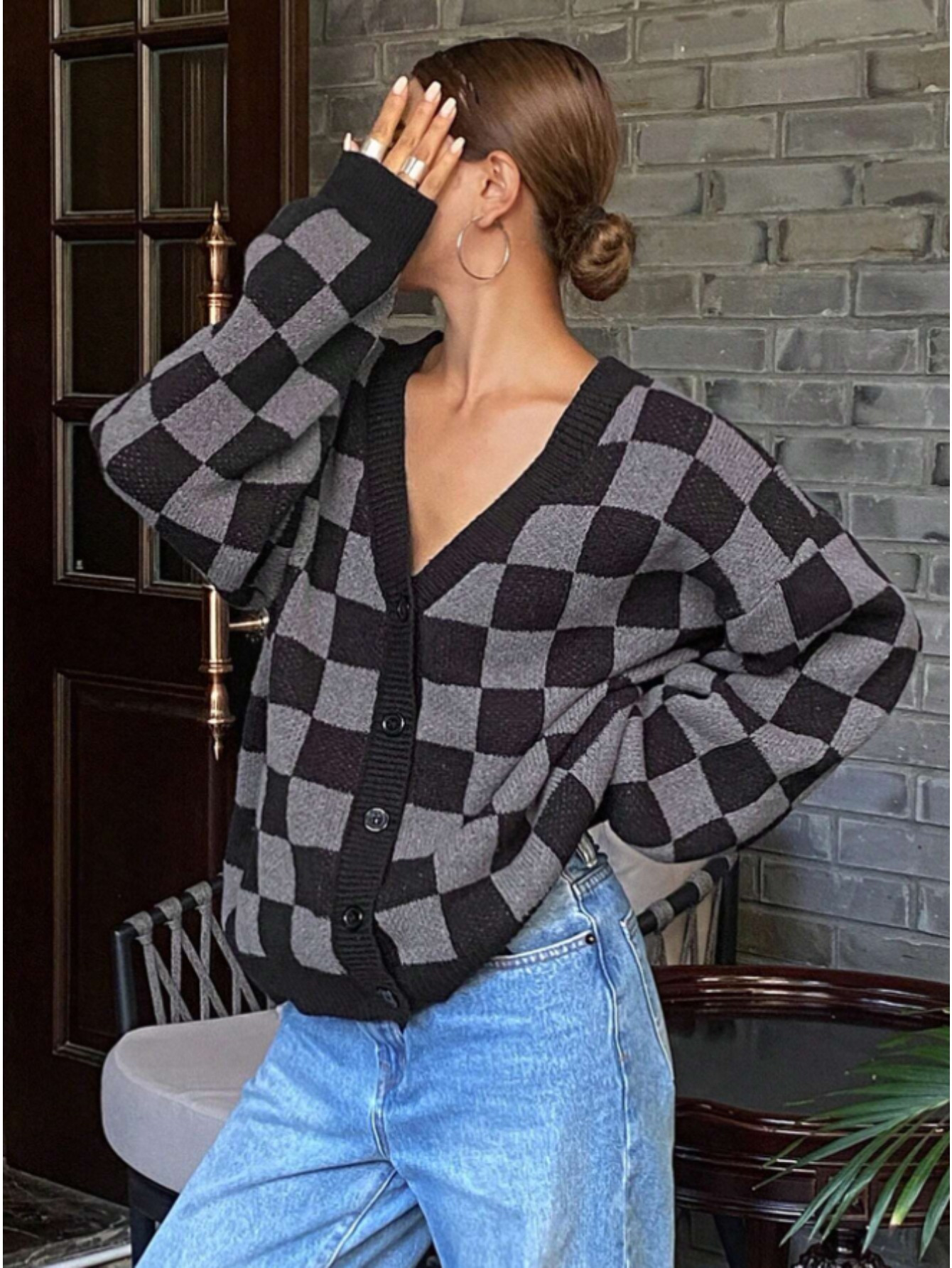 Checkerboard Pattern Casual Cardigan Sweater for Women, Long Sleeve Tops