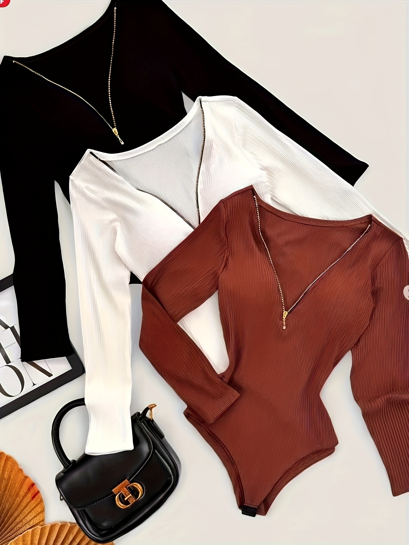 Set of 3 Autumn and Winter V-Neck Ribbed Zipper Stretch Comfortable Versatile Long-Sleeve Pullover Jumpsuit