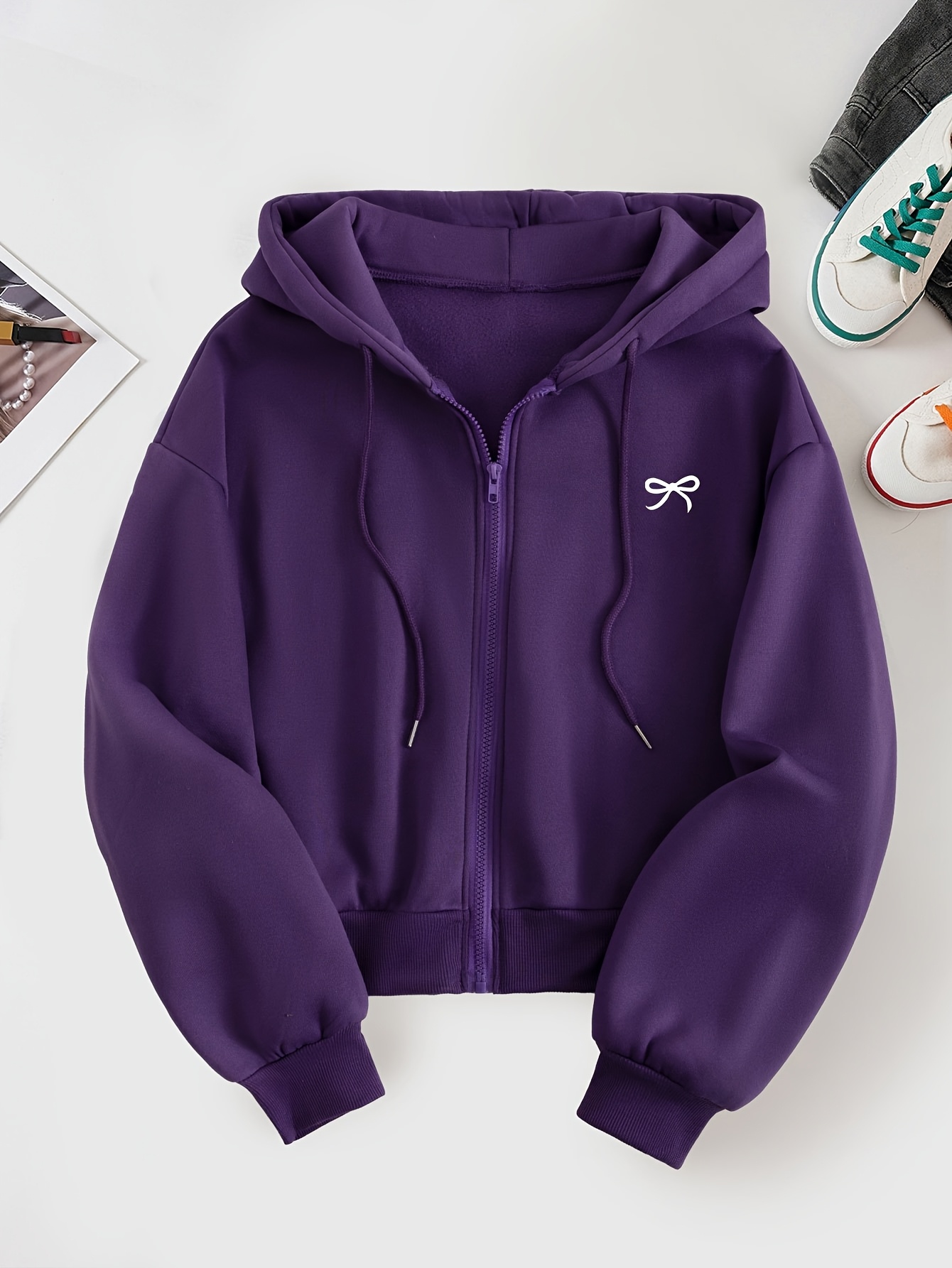 Women'S Casual Gray Hoodie with Double Bow Print - Long Sleeve, Zip-Up Pullover, All-Season Comfort, Casual Wear Hoodie|Casual Style Hoodie|Zippered Hoodie