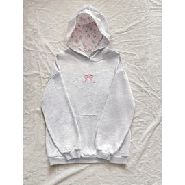 Women'S Casual Hoodie with Bow & Floral Design - Oversized Long Sleeve Pullover, Light Gray with Pink Accents, Easy to Match with, Spring/Summer/Fall Style, Autumn Casual Wear | Casual Style Hoodie | Construction, Essential Hoodie