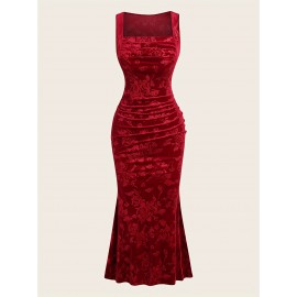 Women'S Elegant Burgundy A-Line Maxi Dress with Puffed Sleeve & Square Neck - Solid Color Floor-Length Formal & Semi-Formal Evening Gown, Machine Washable For Spring Summer Fall Events, Dresses For Wedding Guest, Seasonal Fashion, Sophisticated Styl