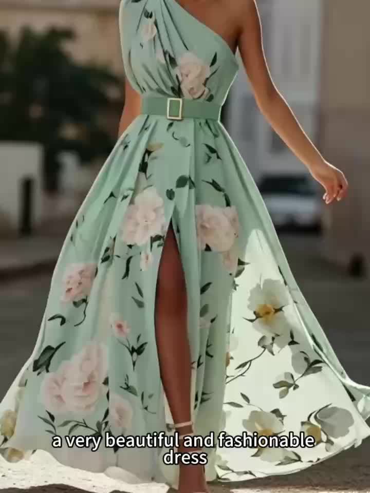 Women'S Elegant Floral maxi dress - One Shoulder Formal & casual party, Wedding Guest Gown - Lightweight Chiffon A-Line Dress with Flowy Train - Spring/Summer/Fall Evening Outfits - LL168, Spring Fashion, Asymmetrical Hemline, Delicate Detailing