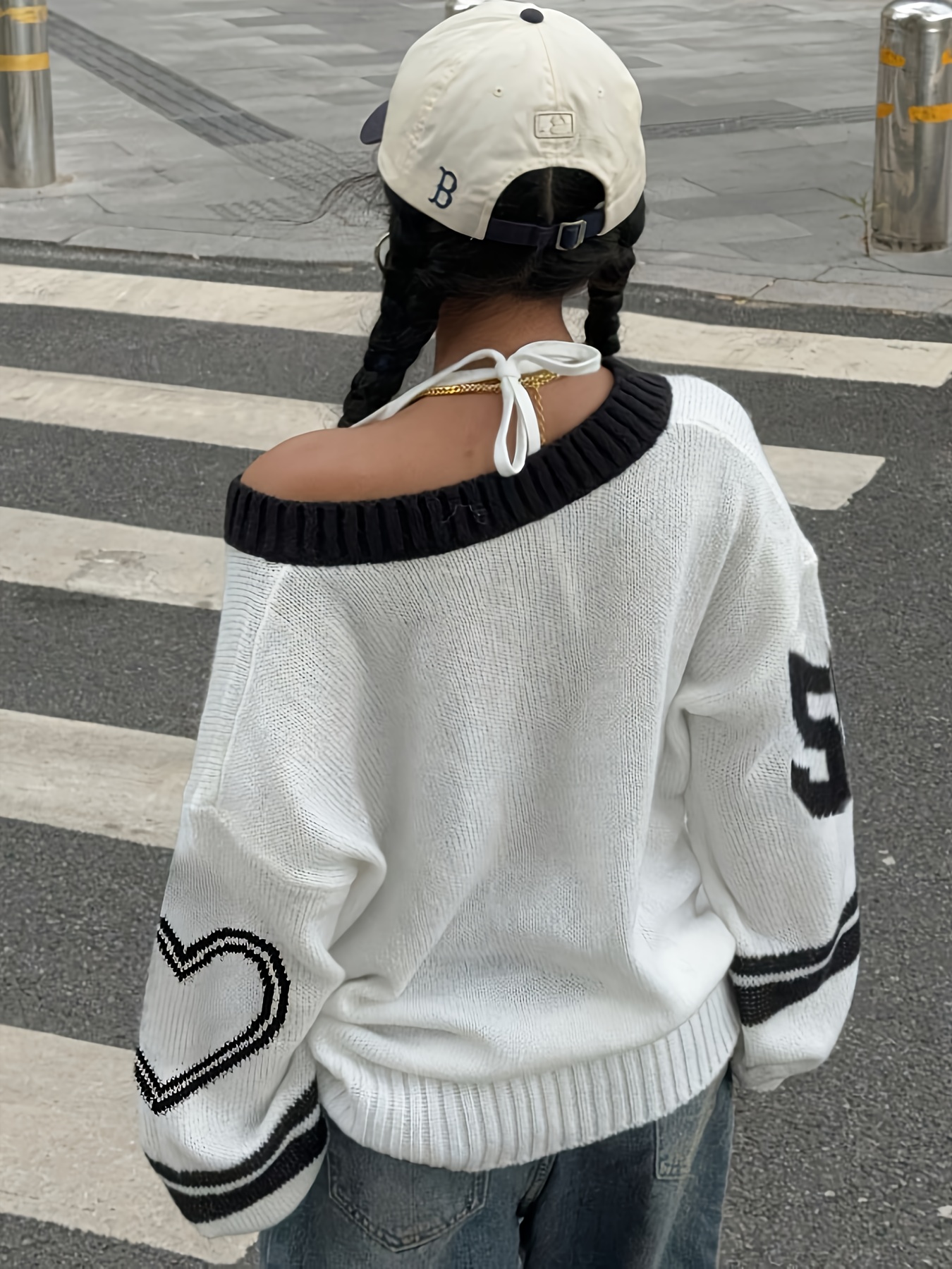 Women'S Elegant V-Neck Sweater with Heart Print - Casual Off-Shoulder Pullover, Black & White, Long Sleeve, Ribbed, Perfect for Office, College, or Casual Attire, Casual Attire Sweater | Offshoulder Fashion | Ribbed Texture