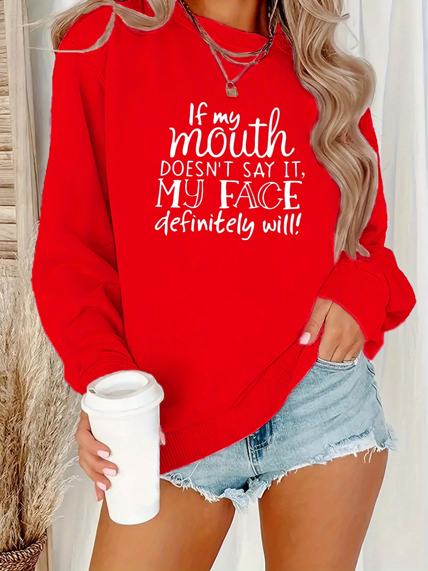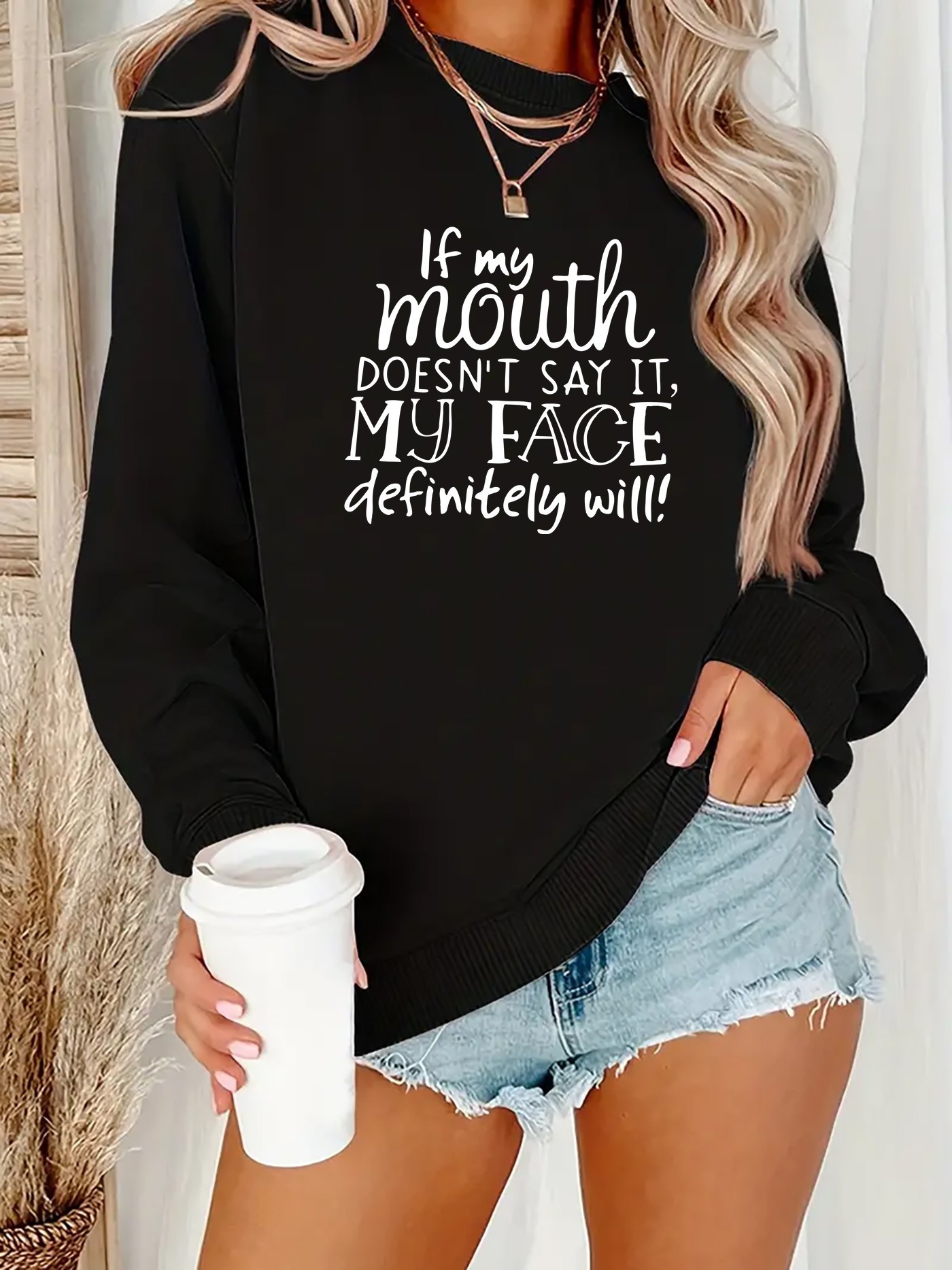 Women's Funny Sassy Quote Sweatshirt - "If My Mouth Doesn't Say It My Face Definitely Will" - Black with White Lettering, Oversized Casual Long Sleeve Round Neck Pullover, Machine Washable Polyester, Fall Winter Warm Humorous Statement Top